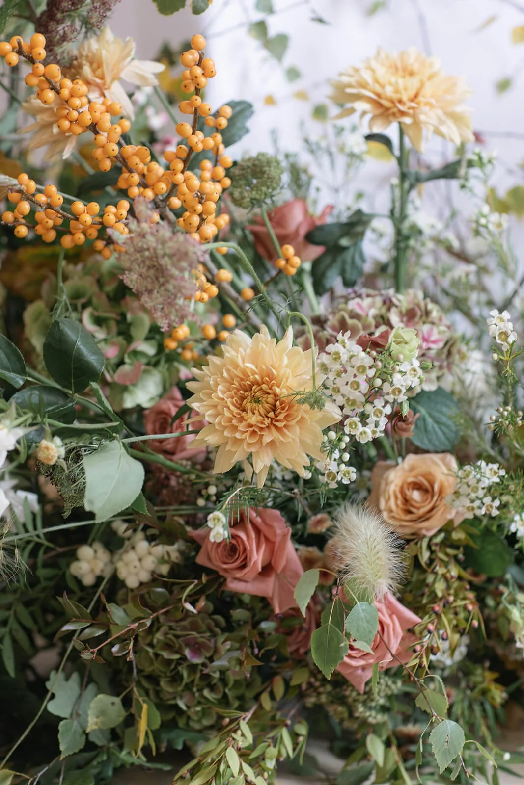 By embracing the tones of the natural landscape in October, golden foliage, soft terracotta tones, muted berries and the final flourish of British-grown blooms, the florals felt grounded, cohesive and quietly luxurious.