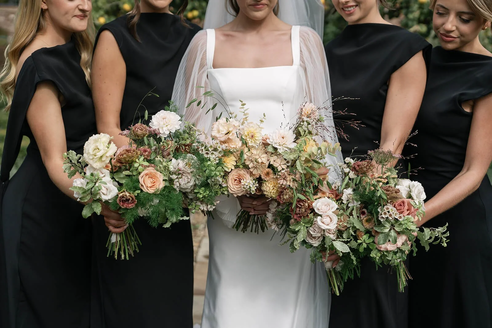 The bridesmaids bouquets echoed the same tonal story in a slightly pinker composition, with soft greenery, lisianthus and premium roses, each slightly different (no two arrangements are the same here!) maintaining cohesion across the bridal party and contrasting with such elegance to their black gowns.