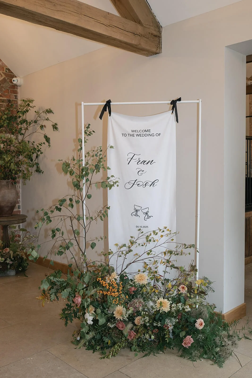 A statement asymmetric floral arrangement framed the bespoke linen welcome sign created by Be Wildly, placed in the entrance hall. Rambling branches brought height, delicate ferns softened the base, and seasonal focal flowers of hydrangeas, berries and chrysanthemums created depth and interest and a teaser of the days floral palette to welcome guests.